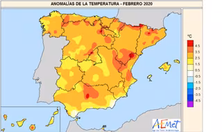 AEMET detalla que febrero fue muy cálido o extremadamente cálido en prácticamente todo el territorio peninsular español. En Baleares fue muy cálido, y en Canarias muy cálido o extremadamente cálido. Las temperaturas máximas diarias se situaron en promedio 3,9C por encima del valor normal de febrero, mientras que las mínimas diarias fueron 2,1C superiores a las normales resultando, por tanto, una oscilación