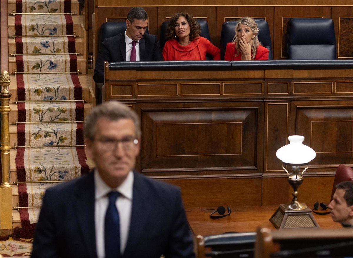 (I-D) El presidente del Gobierno, Pedro Sánchez; la vicepresidenta primera y ministra de Hacienda, María Jesús Montero y la vicepresidenta segunda y ministra de Trabajo, Yolanda Díaz, mientras llega a intervenir el líder del PP, Alberto Núñez Feijóo, du - Eduardo Parra - Europa Press