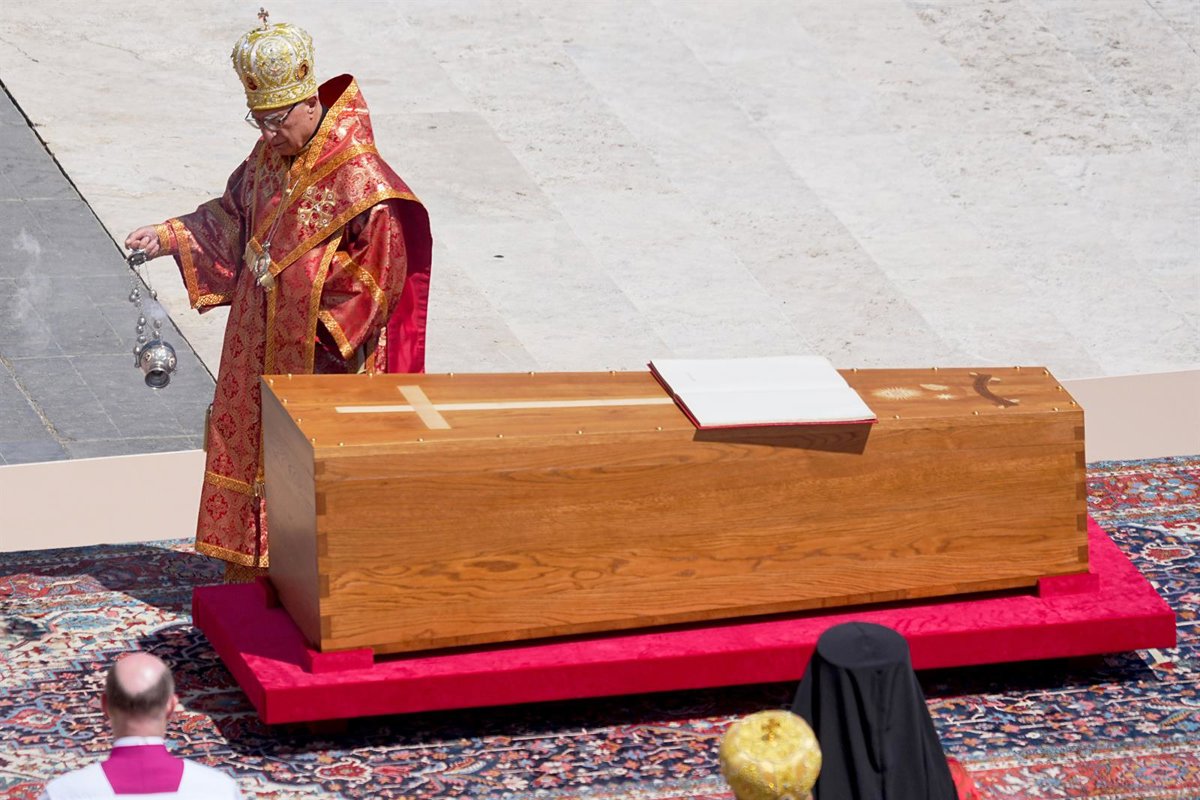 26 April 2025, Vatican, Vatican City: Joseph Absi, Patriarch of Antioch and head of the Melkite Greek Catholic Church, distributes incense at the closed coffin of the late Pope Francis in St. Peter's Square. The Argentine pontiff, who led the Catholic Chu - Michael Kappeler/dpa