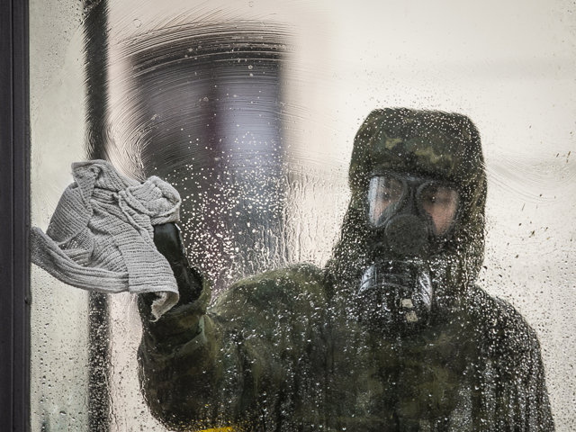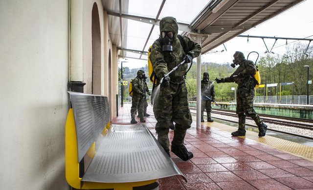 Las seis fotografías premiadas fueron tomadas en Pola de Siero (Asturias) el primer día de abril de 2020 en pleno confinamiento y captan momentos de miembros del Éjercito haciendo labores de desinfección en las calles y estaciones de transporte.