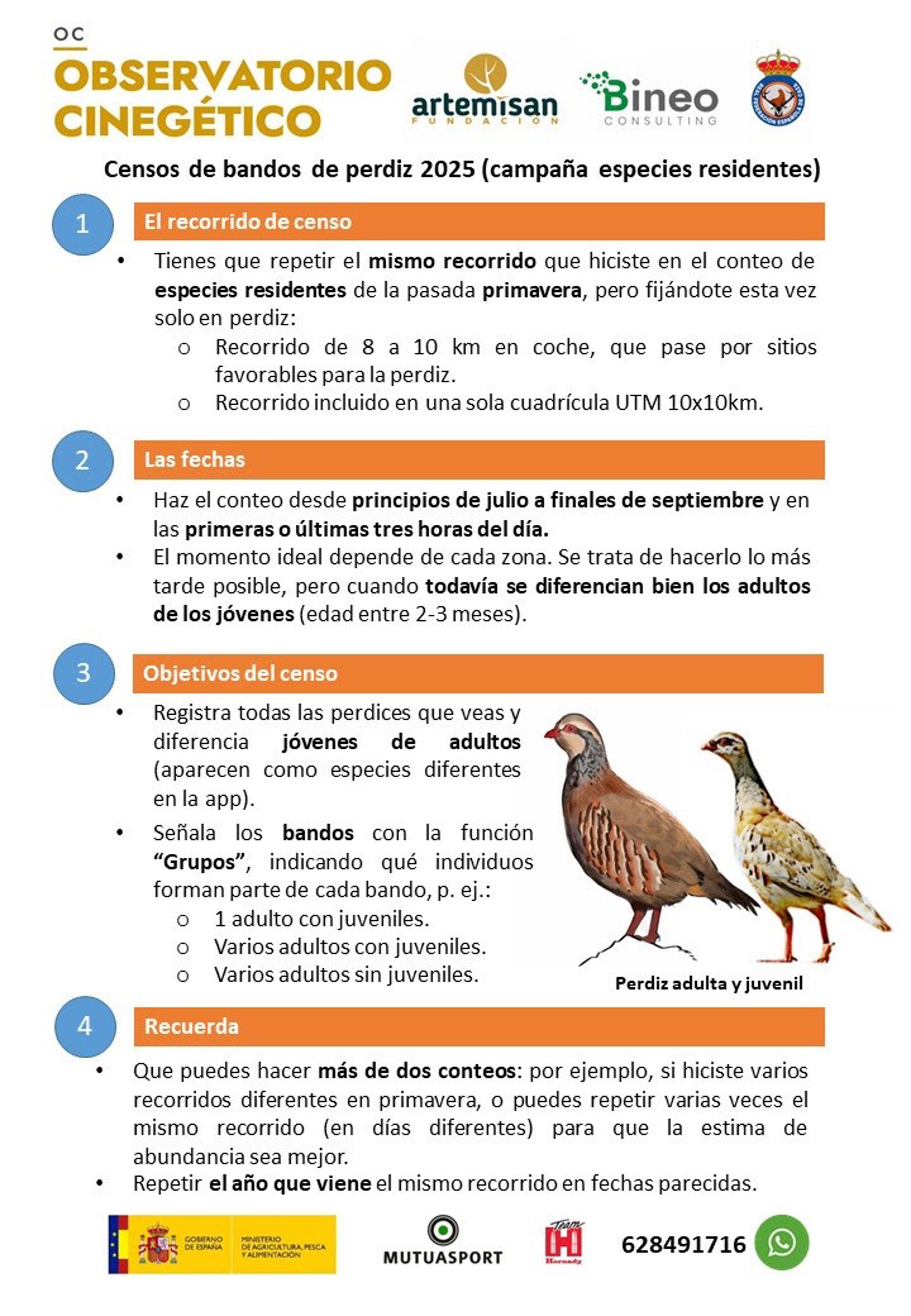 Esta campaña pretende alcanzar al menos los 1.230 censos en un total de 670 cuadrículas que se lograron en la primavera de este año en la campaña de especies residentes, un hito para el proyecto hasta el momento. Los censos de bandos de perdiz se llevarán a cabo en un recorrido de ocho a diez kilómetros en una sola cuadrícula UTM 10x10km., que deberá ser el mismo realizado en el conteo de especies residentes de primavera.