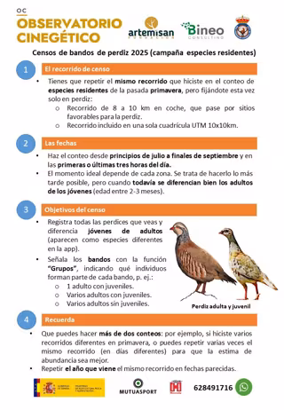 El Observatorio Cinegético, creado por, entre otros, la Fundación Artemisan, ha puesto en marcha una nueva campaña de censos de bandos de perdiz que los colaboradores de la herramienta realizarán hasta septiembre en las primeras o últimas horas del día.