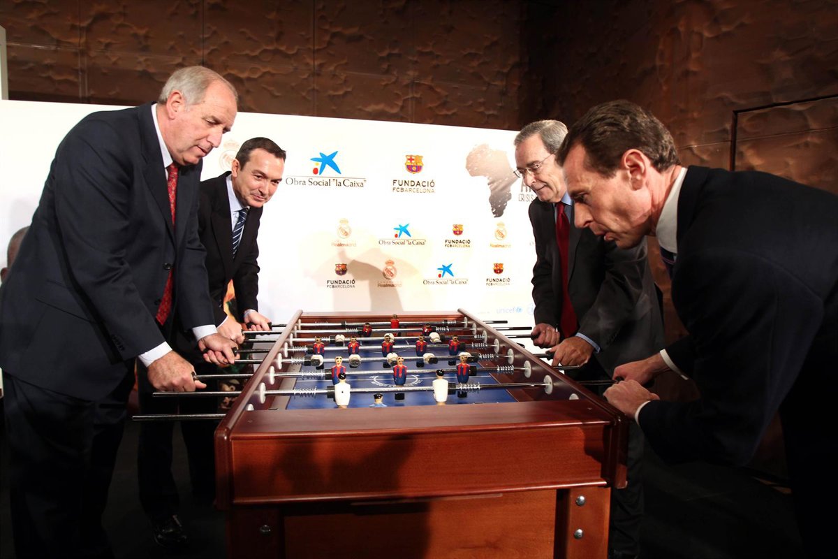La iniciativa ha sido presentada esta mañana por el director ejecutivo de la Obra Social 'la Caixa', Jaime Lanaspa; el director de Relaciones Institucionales del Real Madrid, Emilio Butragueño; y el asesor del presidente del FC Barcelona, Carles Rexach, con un partido solidario de futbolín en CaixaForum Madrid.
