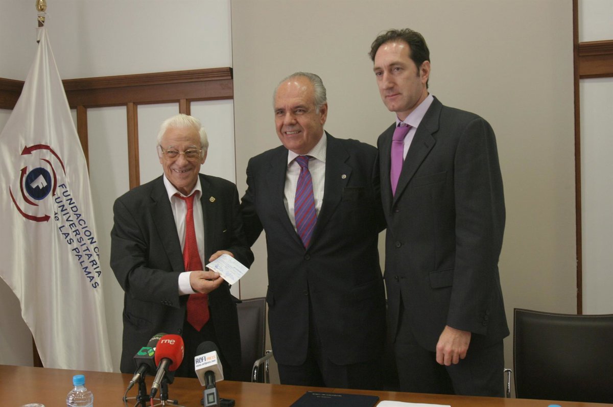 El presidente de la Fundación Universitaria de Las Palmas (FULP), Manuel Campos, y el Padre Ángel García presentaron en la capital grancanaria el 'Proyecto de Cooperación para la creación de una ludoteca para los niños de Benin', que será creada en uno de los centros recuperados por Mensajeros de la Paz en este país africano, y de la que se beneficiarán más de 150 niños, además de sus familias.