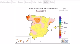 En lo que va de año, el mes de febrero de 2019 ha sido "muy seco" con menos de un tercio de las precipitaciones normales lo que sitúa al conjunto de España en un nivel negativo similar al resultado de lluvias mensual, pero para tener una mayor perspectiva, si se tiene en cuenta el IPS de los últimos seis meses, la mitad oeste de la Península y la mitad occidental de Canarias, también registra un índice de sequía de entre 0,5 y 1 puntos por debajo del valor normal.