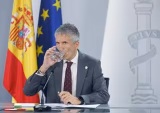 El ministro del Interior, Fernando Grande-Marlaska, bebe agua durante una rueda de prensa posterior al Consejo de Ministros, en el Palacio de La Moncloa, a 20 de junio de 2023, en Madrid (España). El Consejo de Ministros ha aprobado hoy declarar zonas a
