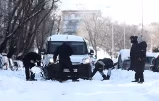 Vecinos del barrio de Pueblo Nuevo ayudan a un conductor a sacar su coche de la nieve, en Madrid (España), a 13 de enero de 2021. Madrid sigue cubierto de nieve cinco días después de la gran nevada provocada por el paso de la borrasca Filomena. El A - Eduardo Parra - Europa Press