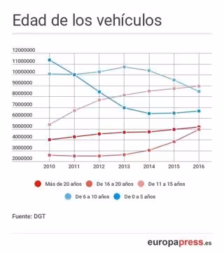 Un análisis de la fecha de matriculación de los vehículos presentes en las carreteras españolas entre 2010 y 2016 permite ver cómo se ha producido este envejecimiento. Si en 2010 el grupo más numeroso de vehículos tenía entre 0 y 5 años, en 2016 son los vehículos entre 11 y 15 años. Destaca también el aumento de vehículos de 16 a 20 años de edad.