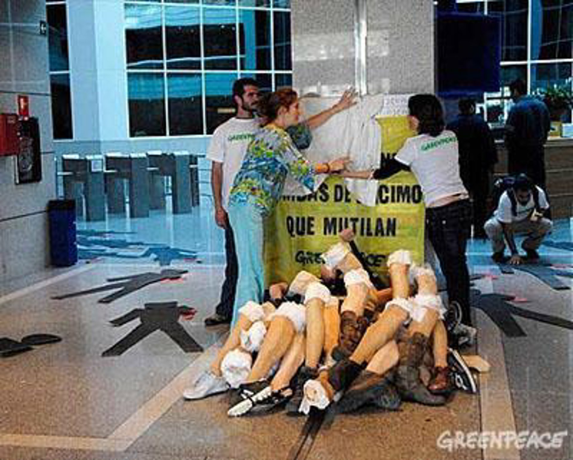 Activistas de la organización ecologista Greenpeace desplegaron hoy en Madrid una pancarta gigante en la fachada de la compañía Explosivos Alaveses (Expal) e introdujeron en el edificio prótesis de personas amputadas y siluetas de cartón representando a las víctimas, en una acción para manifestar su rechazo a las bombas de racimo.