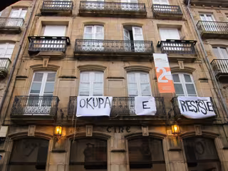 Un grupo de personas aún sin identificar se ha instalado en el edificio del antiguo Cine Yago, en pleno casco histórico de Santiago de Compostela, y ha colocado una pancarta en los balcones de la primera planta en la que puede leerse: "Okupa y resiste".