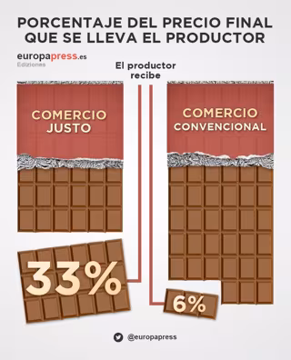 Por ejemplo, del precio final de una tableta de chocolate, el productor recibe un 33 por ciento si se trata de Comercio Justo, mientras que si recurre al producto convencional, éste percibirá tan sólo un 6 por ciento, según recoge el Observatorio de las Corporaciones Transnacionales de Ideas.