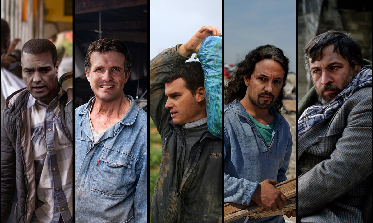En este sentido, ha vestido los líderes de los principales partidos con un aspecto envejecido, ejerciendo trabajos precarios y viviendo en situación de exclusión social. A Sánchez Le ha presentado como un miembro del top manta, a Abascal de mendigo, y a Iglesias de chatarrero, entre otros contextos de pobreza.