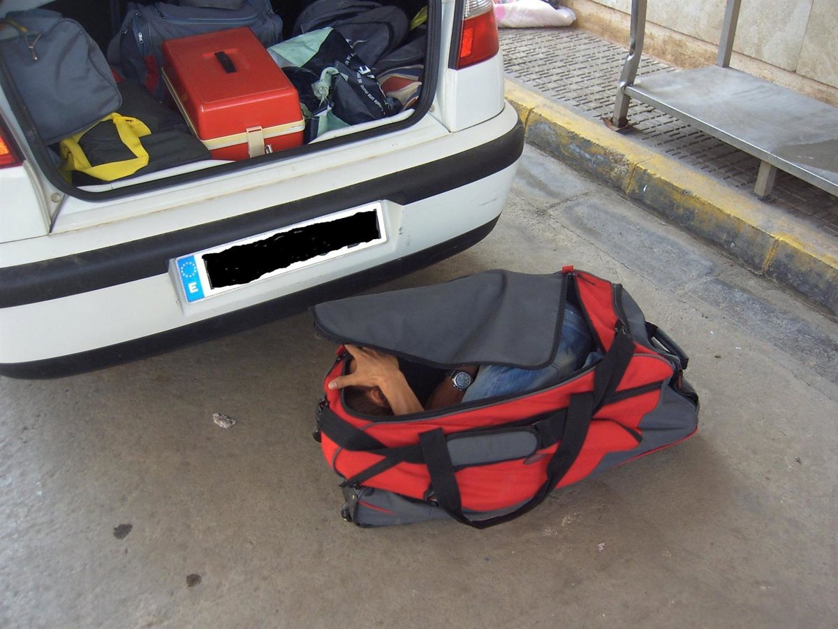 La Guardia Civil ha descubierto a un inmigrante oculto en el interior de un bolso de viaje, totalmente contorsionado, en el maletero de un vehículo conducido por un familiar que se disponía a cruzar la frontera entre Melilla y Marruecos.