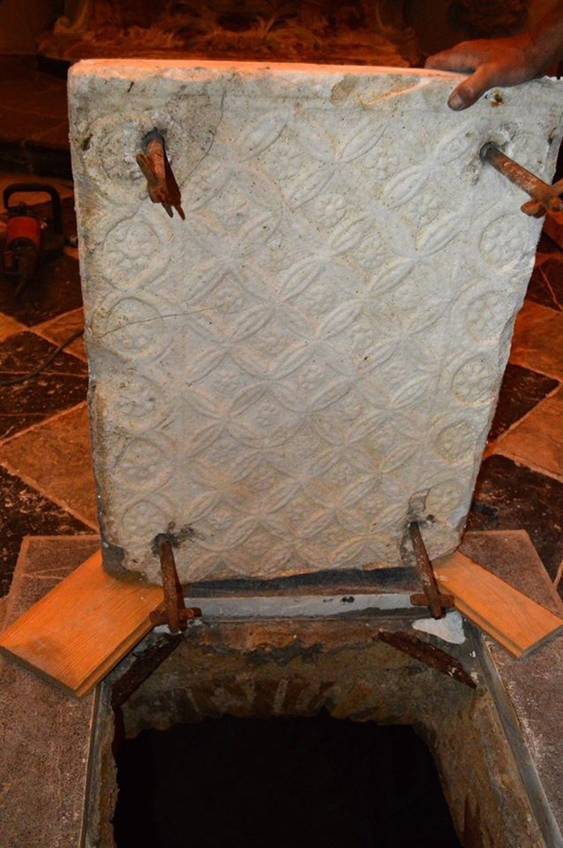 El hallazgo se produjo mientras se realizaban labores de mantenimiento en la capilla de San Nicolás y Ihesu Verde, que se encuentra adosada al muro oriental del Conjunto Monumental Mezquita-Catedral. El relieve apareció en el reverso de la losa que cerraba la cripta situada en el subsuelo de la capilla.