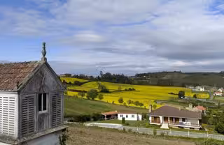 Varias casas frente a los campos sembrados de Brassica napus, planta de la que se obtiene el aceite de colza, a 10 de abril de 2023, en Paiosaco, A Laracha, A Coruña (España). El cultivo de colza se ha convertido en uno de los cultivos más rentables, ya - M. Dylan - Europa Press
