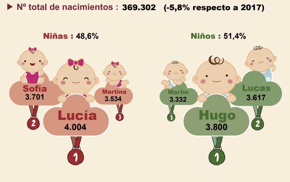 En total, 3.800 niños nacidos el año pasado fueron inscritos como Hugo, el nombre más común durante cinco años hasta 2017 y que en 2018 volvió a liderar el ranking. El segundo nombre de niño más frecuente es Lucas con 3.617 inscritos, seguido de Martín con 3.332. Daniel (3.223); Pablo (3.139); Mateo (3.100); Alejandro (3.000); Leo (2.651), Álvaro (2.465) y Manuel (2.476), les siguen en el ranking.
