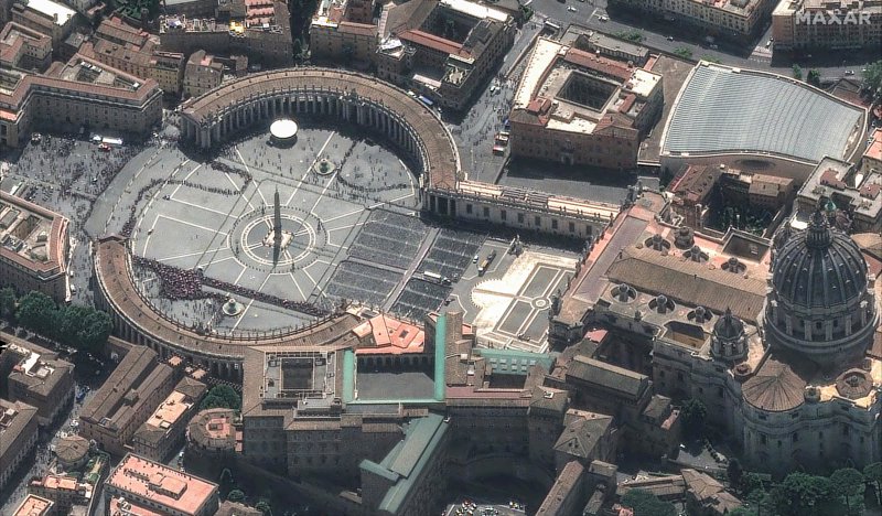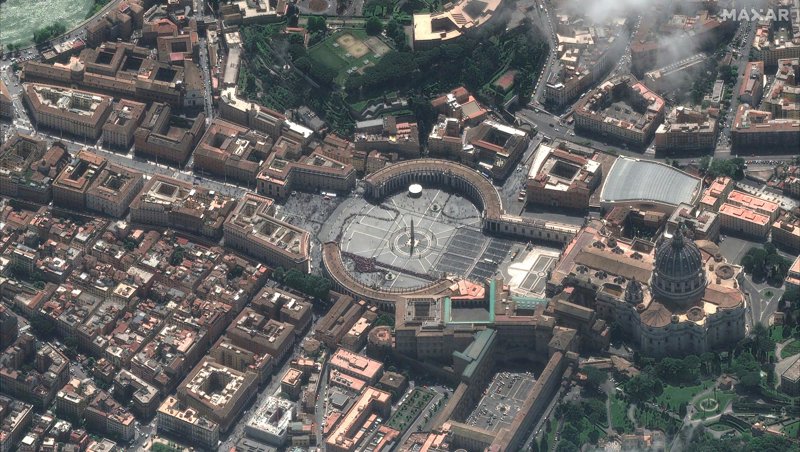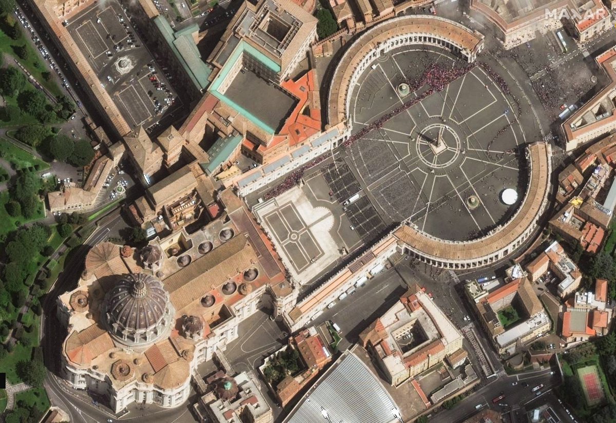 Las imágenes de satélite distribuidas por la empresa estadounidense Maxar Technologies muestran las largas colas de fieles que se han congregado en la Plaza de San Pedro del Vaticano para acceder a la Basílica y despedirse del Papa Francisco, fallecido este lunes 21 de abril, a los 88 años.
