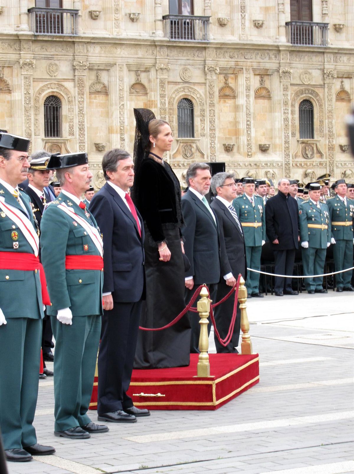 La Infanta Elena ha hecho entrega este jueves de una bandera nacional a la XII Zona de la Guardia Civil en Castilla y León en un acto que ha tenido lugar en la Plaza de San Marcos de la localidad leonesa y la primogénita de los Reyes deseó que sirva como "estímulo" en la tarea diaria de los agentes al servicio de España.