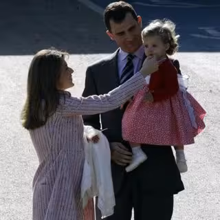 Pasaban unos minutos de las seis de la tarde cuando sus Altezas salieron del centro. Doña Letizia, vestida con abrigo y pantalones rosa pálido, sujetaba en brazos a la recién nacida, abrigada con una mantilla de color crema. Don Felipe, con traje de raya diplomática, a la Infanta Leonor, que lucía un gracioso vestido rojo y blanco con chaqueta de punto roja y zapatos blancos.