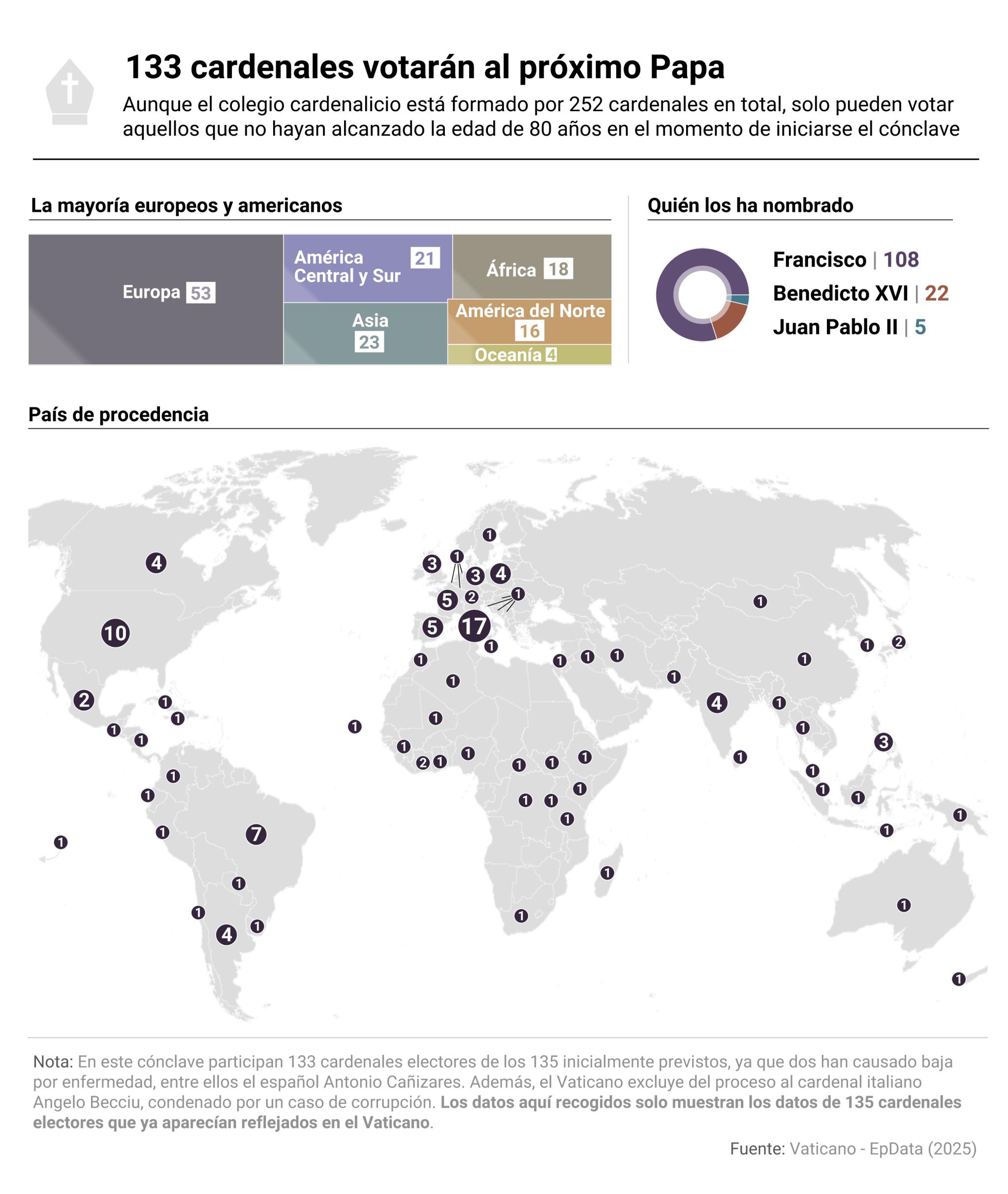 Este miércoles 7 de mayo arranca en el Vaticano el cónclave que elegirá al sucesor del Papa Francisco. Se trata de un proceso complejo y cargado de simbolismo, en el que 133 cardenales menores de 80 años votarán al nuevo Pontífice. Para facilitar la comprensión de este procedimiento, Europa Press ha elaborado varias infografías clave que explican el mapa de cardenales, quiénes pueden votar y cómo se desarrolla la elección paso a paso.