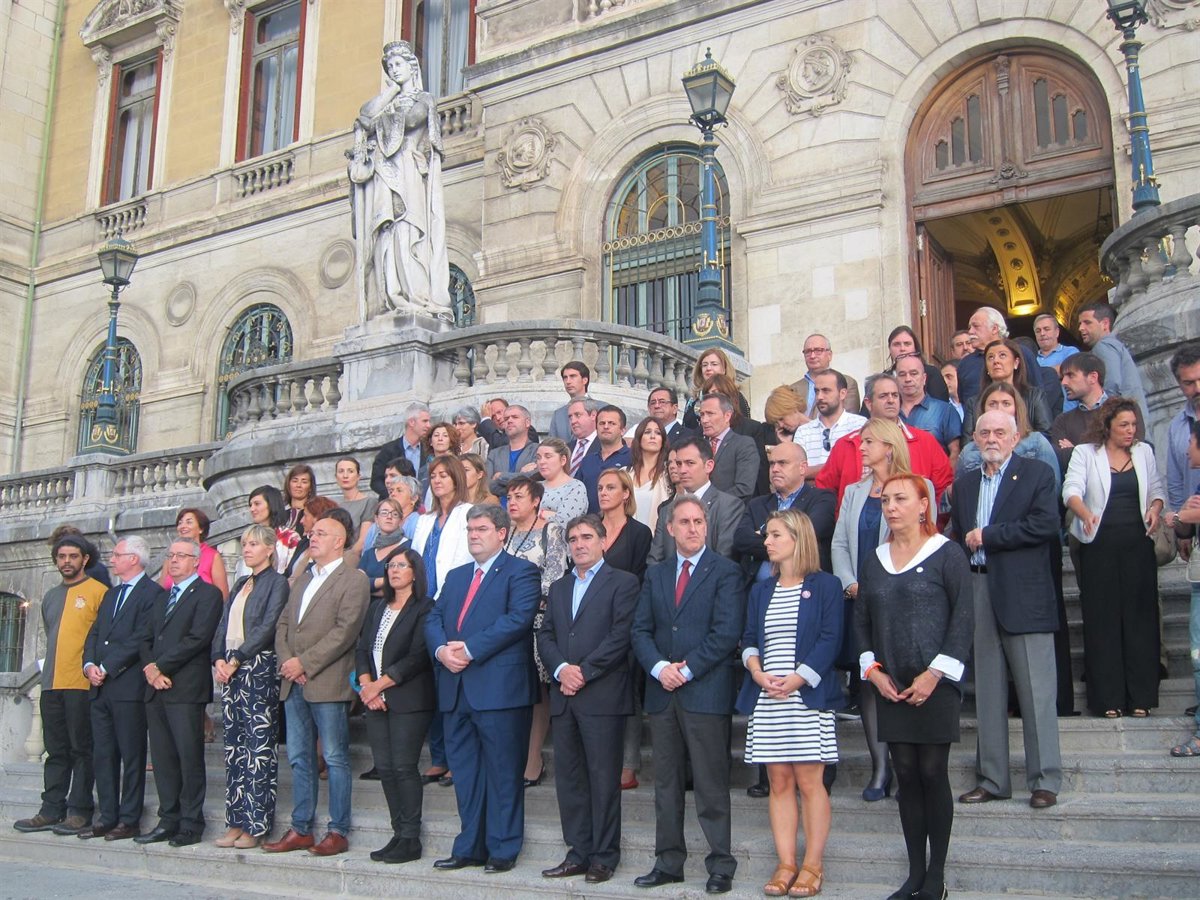 La concentración se ha desarrollado, a la una de la tarde, en las escalinatas de la Casa consistorial en silencio y sin ninguna pancarta. La protesta ha estado encabezada por los alcaldes de Bilbao, Juan María Aburto, y Erandio, Joseba Goikouria, acompañados por concejales del PNV, EH Bildu, PSE-EE y PP.