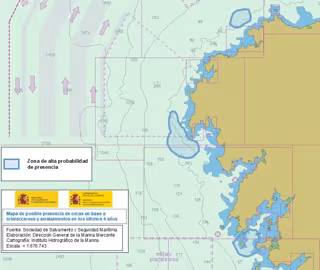 Como novedad, Transición Ecológica ha informado de que se ha elaborado un mapa específico para la costa de Galicia a partir de los datos históricos registrados en el norte peninsular, que identifica las zonas con mayor riesgo de contacto por presencia de orcas, con el objetivo de reforzar la seguridad de la navegación y reducir estos episodios. Asimismo, se mantiene el mapa de riesgo para el área comprendida entre el Golfo de Cádiz y el Estrecho de Gibraltar.