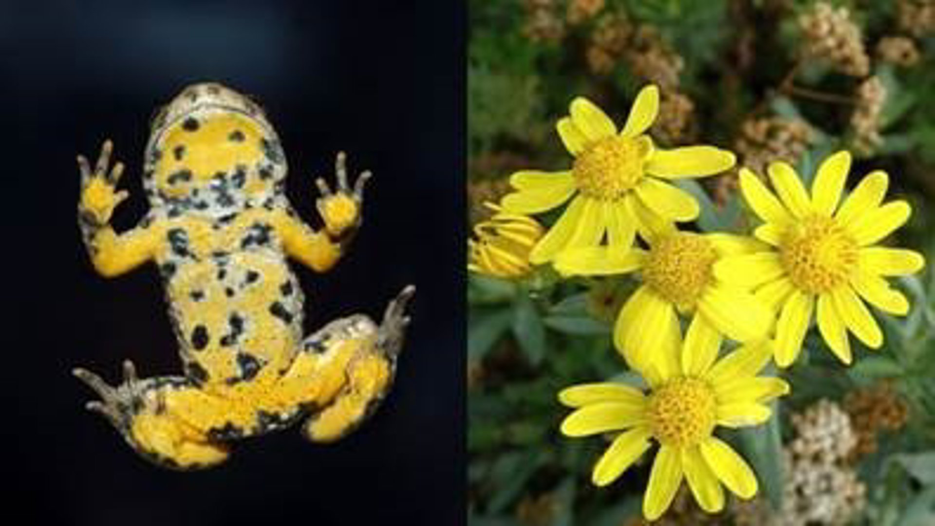 Imágenes de dos especies ampliamente conocidas por formar una zona híbrida con sus respectivos congéneres. A la izquierda Bombina variegata, y a la derecha imagen de un ejemplar de Senecio aethnensis. - RJB-CSIC