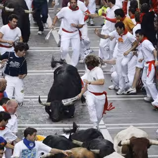 En la calle Estafeta había más corredores que en días anteriores y eso provocó que hubiera más caídas. Así, mediada la calle, hubo una pequeña montonera que fue arrollada por el último grupo de toros. Unos metros más adelante, los animales volvieron a arrollar a varios corredores.