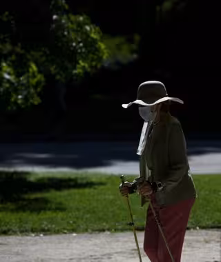 Una mujer camina con bastones en el Parque del Retiro en Madrid (España), a 29 de junio de 2020. El calor pone desde este lunes en aviso a una quincena de provincias de Andalucía, Castilla y León, Castilla-La Mancha, Extremadura y Madrid, por temperatur - Óscar Cañas - Europa Press