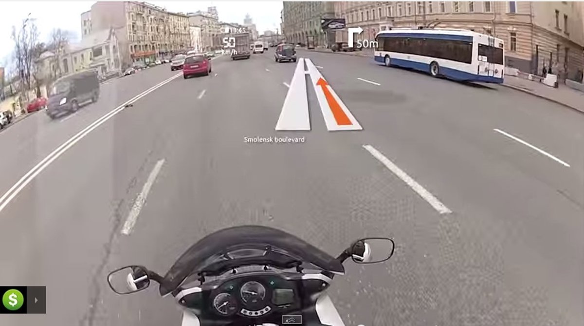 El mapa que marca la ruta seleccionada por voz es más simple que el de los GPS habituales ya que la imagen se proyecta en la parte frontal del casco, que es translúcida y permite que el conductor vea también la carretera, como se muestra en el vídeo.