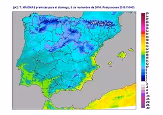 Las temperaturas máximas del domingo estarán en torno a 10 grados centígrados en la mitad norte aunque en los sistemas montañosos se quedarán en los 8 grados centígrados mientras que en la mitad sur tendrán de 10 a 14 grados centígrados excepto en la costa sur, sureste y Baleares, donde alcanzarán de 18 a 22 grados centígrados.