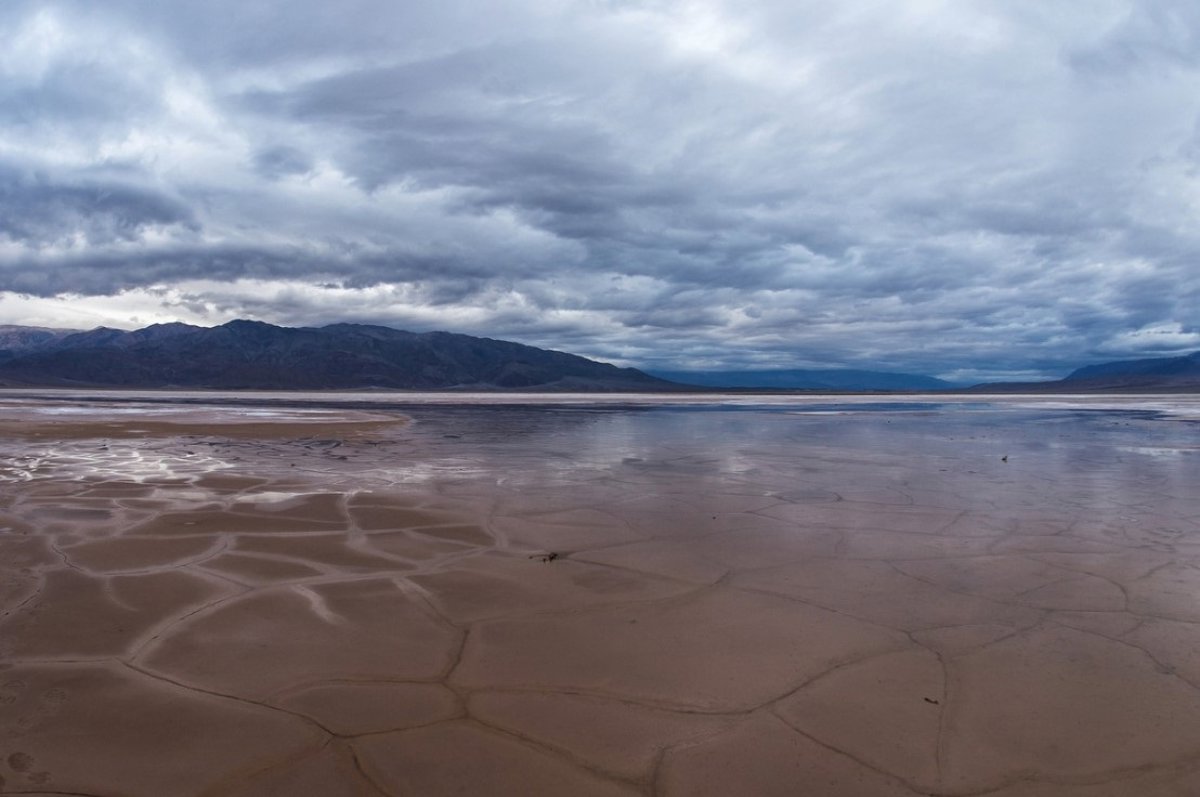 El barro agrietado y la sal en el fondo del valle del Parque Nacional del Valle de la Muerte en California pueden convertirse en un estanque reflectante después de las lluvias - NPS/KURT MOSES