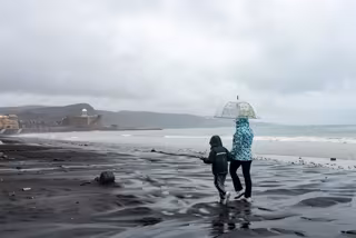 Archivo - Dos personas se cubren de la lluvia con un paraguas mientras caminan por una playa en Las Palmas de Gran Canaria, Canarias (España). - Europa Press - Archivo