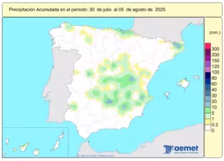 El organismo estatal explica que las precipitaciones afectaron al interior peninsular, a puntos de la cornisa cantábrica, a la mitad este de Cataluña y al norte de las islas canarias de mayor relieve durante el periodo del 30 de julio al 5 de agosto. En este marco, se superaron los 10 l/m2 de manera aislada en la provincia de Girona, en zonas de Castilla-La Mancha y Alicante, en algún punto de la sierra de Gredos y en el norte del País Vasco y Navarra.