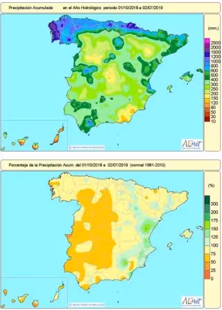 Mapa de lluvias registradas en España desde el 1 de octubre de 2018 al 2 de julio de 2019. Balance hídrico. La falta de lluvias acumulada afecta a la mayor parte del país, excetpo a Levante, Granada y algunas otras zonas localizadas. - AEMET