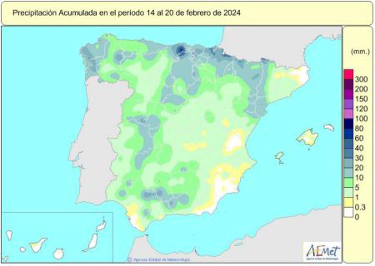 Durante el periodo del 14 al 20 de febrero las precipitaciones afectaron a toda la Península, salvo a pequeñas zonas de Girona, del levante y de la provincia de Cádiz. También afectaron a las islas de Mallorca y las Pitiusas y al norte de las islas de Gran Canaria y Tenerife. Se superaron los 10 l/m2 en el tercio norte peninsular, en la mitad este de Extremadura y en puntos del interior de la mitad oeste de Andalucía.