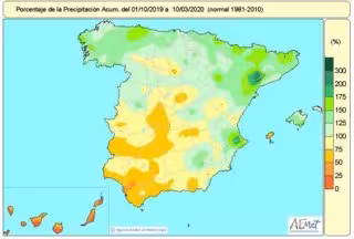 Las lluvias acumuladas en el conjunto de España desde que el 1 de octubre de 2019 comenzó el año hidrológico hasta el 12 de marzo de 2020 alcanzan un valor medio normal de 399 litros por metro cuadrado, lo que supone un 8 por ciento más de lo normal para este periodo, que son 369 litros por metro cuadrado, según la Agencia Estatal de Meteorología (AEMET).