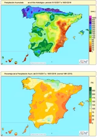 Las precipitaciones acumuladas desde el pasado 1 de octubre hasta el 16 de enero han alcanzado 181 litros por metro cuadrado, lo que supone un 33 por ciento menos de lo normal para este periodo, que son 271 litros por metro cuadrado, según la Agencia Estatal de Meteorología (AEMET).
