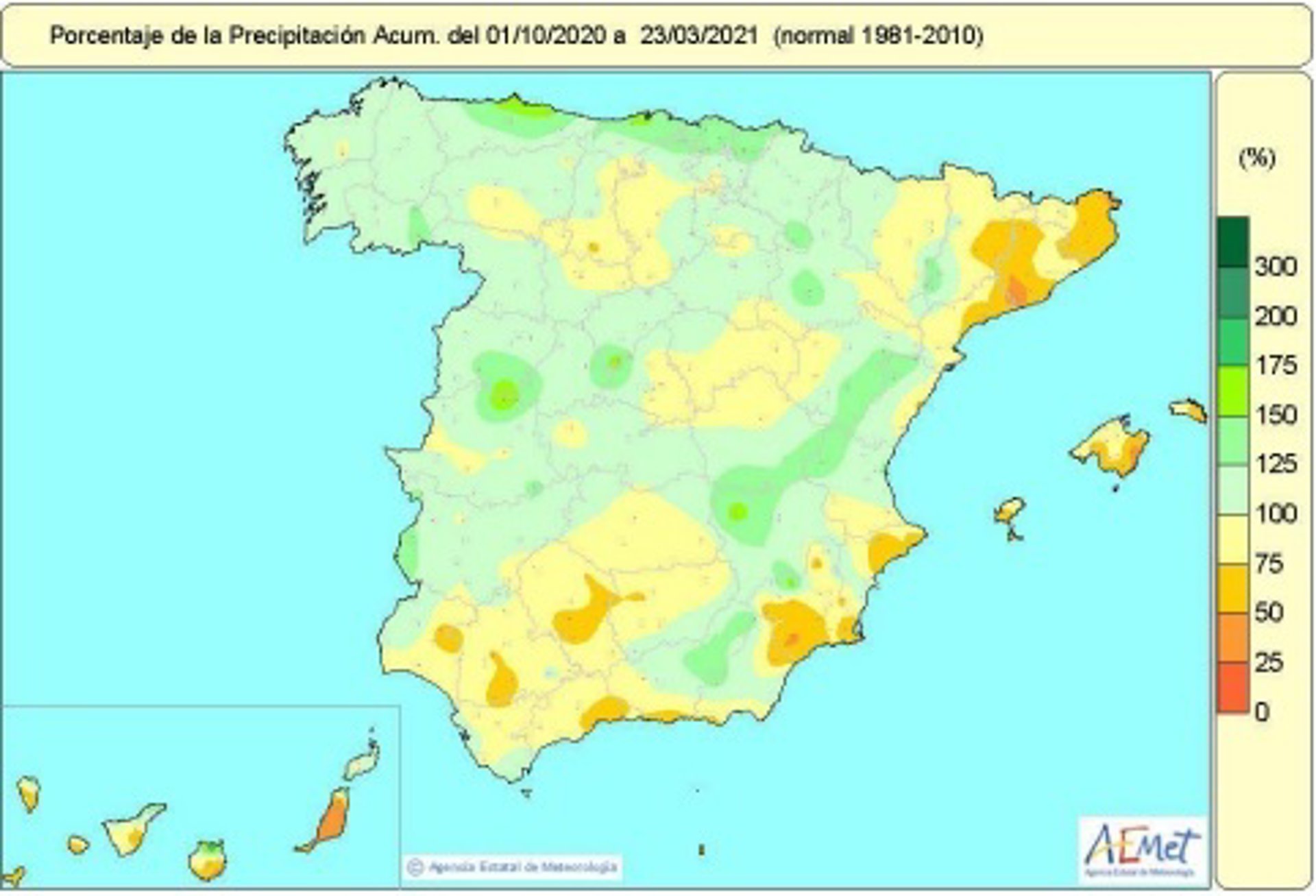 En ese aspecto, la AEMET destaca zonas del interior de la región de Murcia, del sur de la provincia de Barcelona, del este de la isla de Mallorca y la isla de Fuerteventura, que se encuentran por debajo del 50 por ciento de sus valores normales para el mismo periodo.