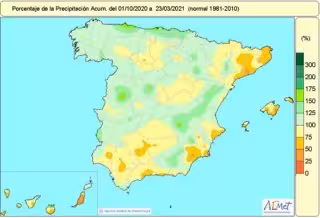 Las lluvias acumuladas desde el inicio del año hidrológico (1 de octubre de 2020) hasta el 23 de marzo de 2021 están un 3% por debajo del valor normal. - AEMET