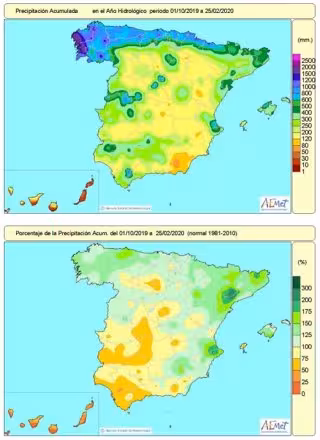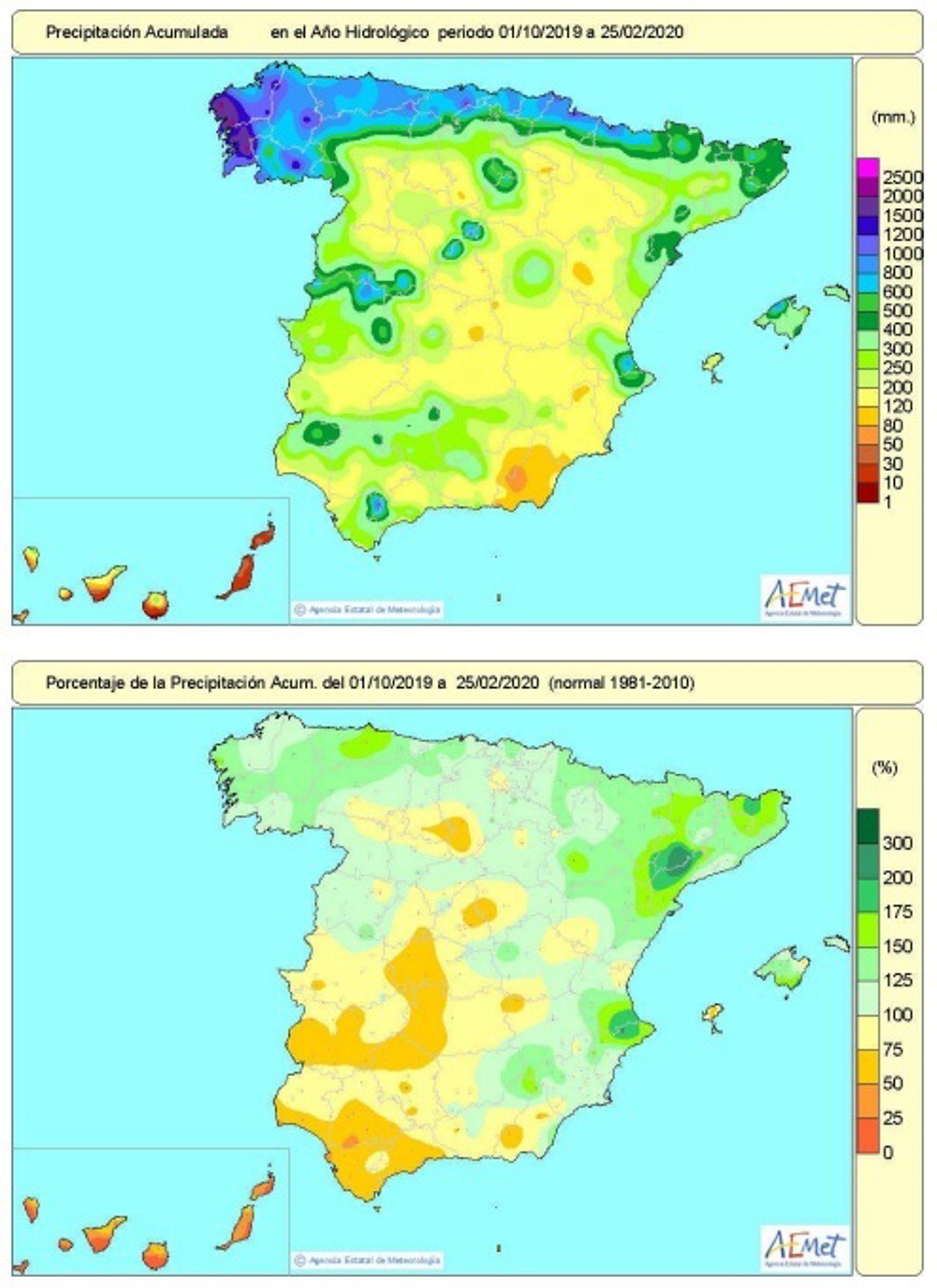 Las precipitaciones acumuladas desde que comenzó el año hidrológico el pasado 1 de octubre hasta el 25 de febrero de 2020 alcanzan los 371 litros por metro cuadrado, lo que supone en torno a un 7 por ciento más que el valor medio normal para este plazo, que son 347 litros por metro cuadrado.