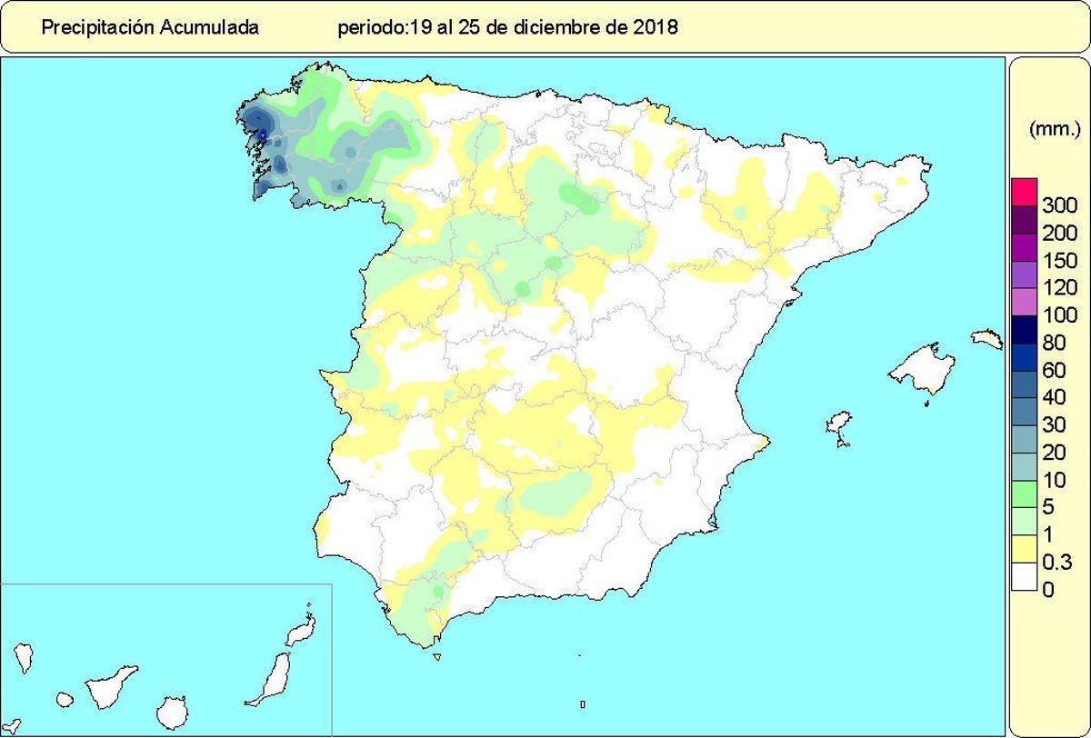 Durante el periodo del 19 al 25 de diciembre las precipitaciones fueron escasas y en su mayor parte cayeron en la mitad occidental peninsular, solo superándose los 10 litros por metro cuadrado en el Bierzo y Galicia, y alcanzándose los 40 litros por metro cuadrado en el oeste de A Coruña.