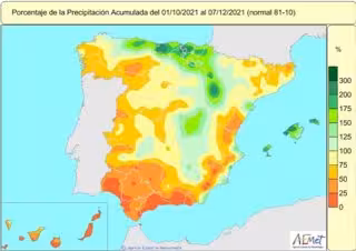 Las lluvias acumuladas desde que el 1 de octubre comenzó el año hidrológico hasta el 7 de diciembre se sitúan un 22 por ciento por debajo del valor normal para este periodo, ya que se ha alcanzado un valor medio para el conjunto de España de 134 litros por metro cuadrado, cuando la cifra climatológica normal es de 172 litros por metro cuadrado, según informa la Agencia Estatal de Meteorología (AEMET).