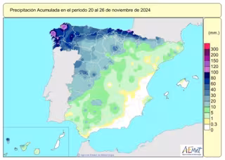 En su resumen de la evolución de las precipitaciones en España, AEMET ha detallado que durante el periodo del 20 al 26 de noviembre las precipitaciones afectaron a la mayor parte del territorio peninsular y a las islas occidentales del archipiélago canario. Así, las precipitaciones estuvieron por encima de los 10 l/m2 en el tercio noroeste peninsular. En Galicia y gran parte de la cornisa cantábrica se superaron los 60 l/m2, mientras que zonas de Galicia occidental y en puntos del norte de Navarra, La Rioja y País Vasco se excedieron los 100 l/m2.