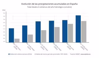 Las precipitaciones acumuladas en España desde el inicio del año hidrológico, el pasado mes de octubre, están un 3% por encima de su valor correspondiente a dicho periodo, según la Agencia Estatal de Meteorología (AEMET). Esto supone un punto más que la semana pasada.