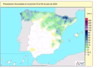 En este sentido, AEMET ha señalado que durante el periodo del 3 al 9 julio las precipitaciones afectaron al tercio norte y levante peninsulares y en menor medida y de manera más aislada a algún punto del oeste de Andalucía y a ambos archipiélagos. Se superaron los 10 l/m2 en la comunidad gallega, a lo largo de Asturias y en zonas del cuadrante nororiental junto con la provincia de Teruel, el interior de Alicante y al sur de Albacete.