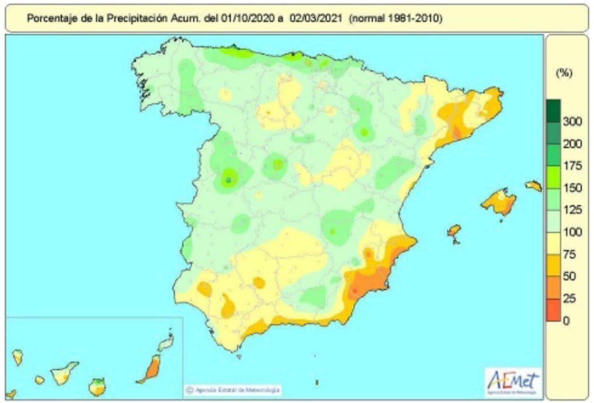 Las lluvias acumuladas en España entre el 1 de octubre de 2020 y el 2 de marzo de 2021 están un 1% por encima del valor normal. - AEMET