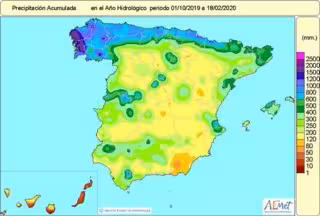 Las precipitaciones acumuladas en el conjunto de España desde que el 1 de octubre de 2019 comenzó el año hidrológico hasta el 18 de febrero superan en un 10 por ciento el valor normal, al recogerse una media de 370 litros por metro cuadrado, cuando el valor medio normal correspondiente a dicho periodo es de 335 litros por metro cuadrado para el conjunto de España, según datos de la Agencia Estatal de Meteorología (AEMET).