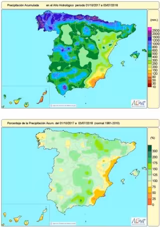 Las lluvias acumuladas en los primeros nueve meses del año hidrológico, desde el 1 de octubre de 2017 al 3 de julio de 2018 han alcanzado un valor de 642 litros por metro cuadrado, lo que supone un 15 por ciento por encima del valor medio normal para el conjunto de España, que son 559 litros por metro cuadrado, según la Agencia Estatal de Meteorología (AEMET).