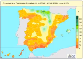 El valor medio de precipitaciones acumuladas en el conjunto de España desde que el pasado 1 de octubre comenzó el año hidrológico hasta el 25 de enero alcanza un valor de 191 litros por metro cuadrado, cuando lo normal sería un valor en torno a 285 litros por metro cuadrado para ese periodo, por lo que la Agencia Estatal de Meteorología (AEMET) informa de que el déficit hídrico es de un 33 por ciento.